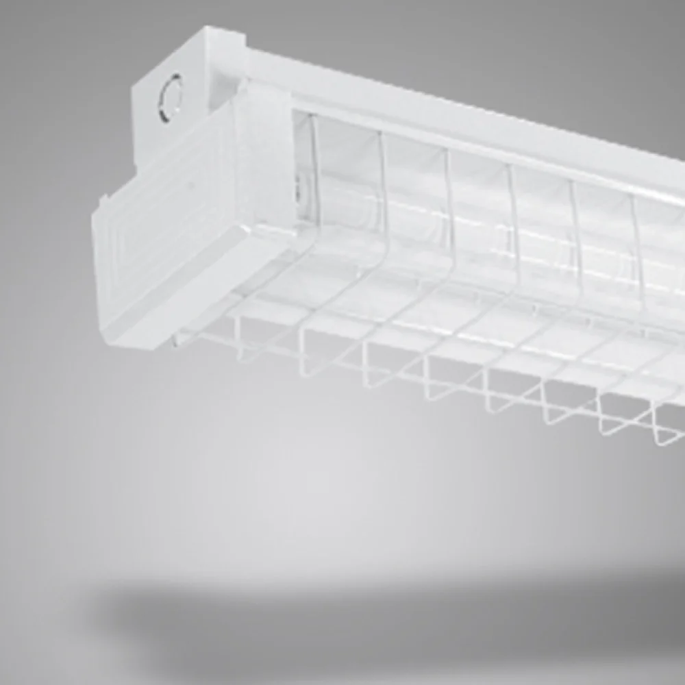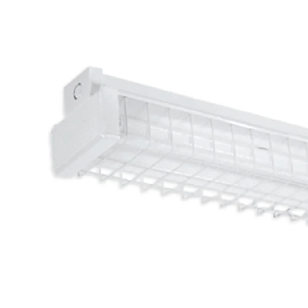 Suitable for ceiling, wall or pendant mounting, heavy gauge galvanized steel epoxy coated wire guard. Plastic snap-on end caps for easy installation. High quality white epoxy powder coated finish. Ideal for public hallways, staircases and corridors.